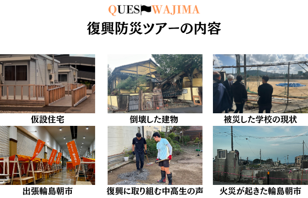 復興防災ツアーでは、倒壊した建物や火災被害を受けた輪島朝市、避難所や仮設住宅、復旧作業の現場を巡り、被災地の声を直接感じていただけます。また、輪島塗りの伝統や本格的な避難所体験もご用意し、幅広いニーズにお応えします。